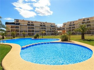 Complejo de pisos construido en dos mil siete ubicado en Denia a diez metros de la playa de arena y de un campo de Golf. La urbe más próxima Gandia. Bares, pub’s y discos a unos 2km de distancia. El castillo de Denia y el puerto a 6’5km. Los pisos se hallan totalmente pertrechados. Dispone de elevador, garaje y una piscina al aire libre. Ofrece bultos singulares para las comidas.